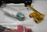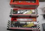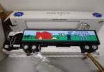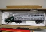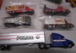 This tray lot of mostly Tractor Trailor trucks includes a Racing Champions 1:87 scale McDonald Racing Team transporter in original box, a Liberty Classics Inc 1/64 scale Kenworth K100E diecast truck in original box, a Hot Wheels diecast heavy duty tow truck, and more. Five are in their original packaging. The others are in used, good condition. Please preview.