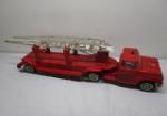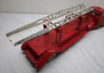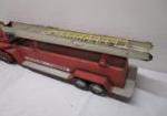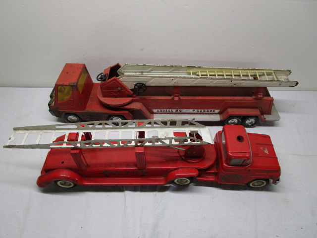 The vintage Nylint Aerial Hook-N-Ladder fire truck measures 30.5" long, has some rust and is missing its red lights. The Buddy L BLFD #3 extension ladder fire truck measures 27" long and is missing it's red light. Please preview.