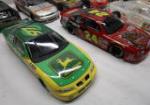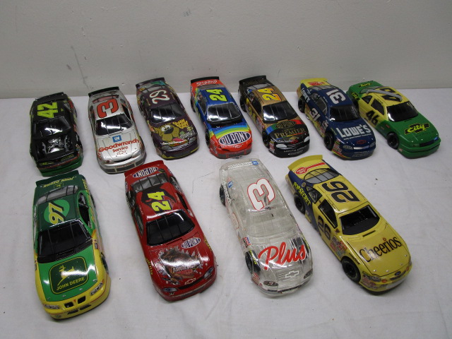 This tray lot of 11 plastic racing cars includes 3 of Jeff Gordon's #24 cars, a Dale Earnhardt #3 car, plus others. These cars measures 8" long. They are in used, good condition with a couple of the cars having missing parts. Please preview.