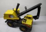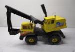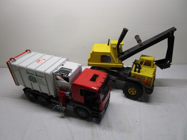 The vintage Tonka Mighty Diesel Excavator measures 19.5" long and the Bruder MAN TGS Side Loading Garbage Truck measures 21" long. Both vehicles are in used good condition with the excavator showing some signs of rust. Please preview.